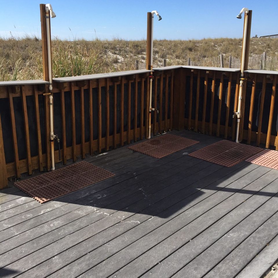 The outdoor showers are on the boardwalk just past the pool. This is great to rinse off your feet and your shells.